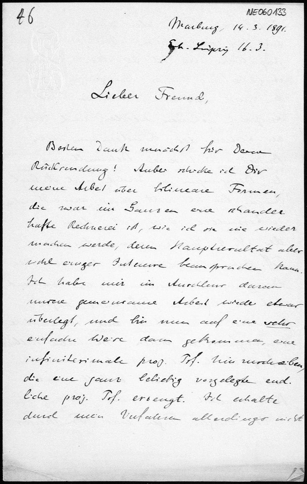Brief von Eduard Study an Friedrich Engel vom 14.3.1891