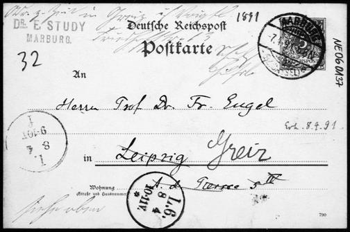 Postkarte von Eduard Study an Friedrich Engel vom 7.4.1891