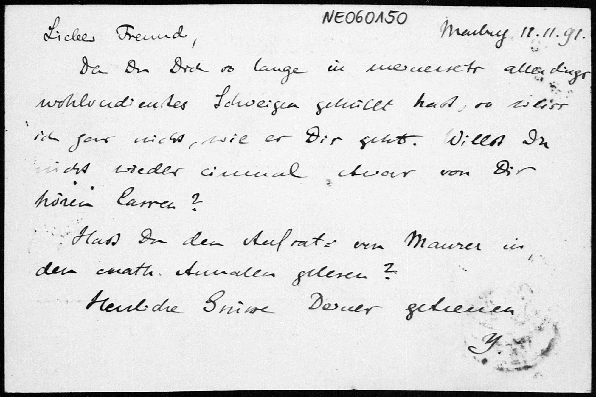 Postkarte von Eduard Study an Friedrich Engel vom 11.11.1891