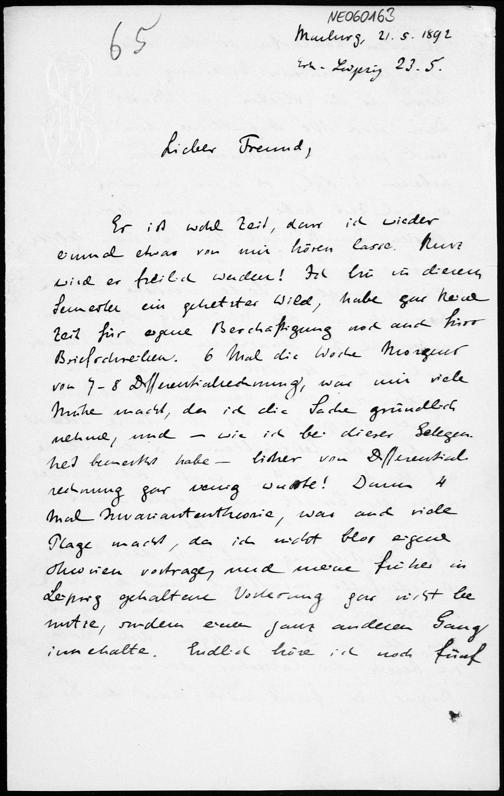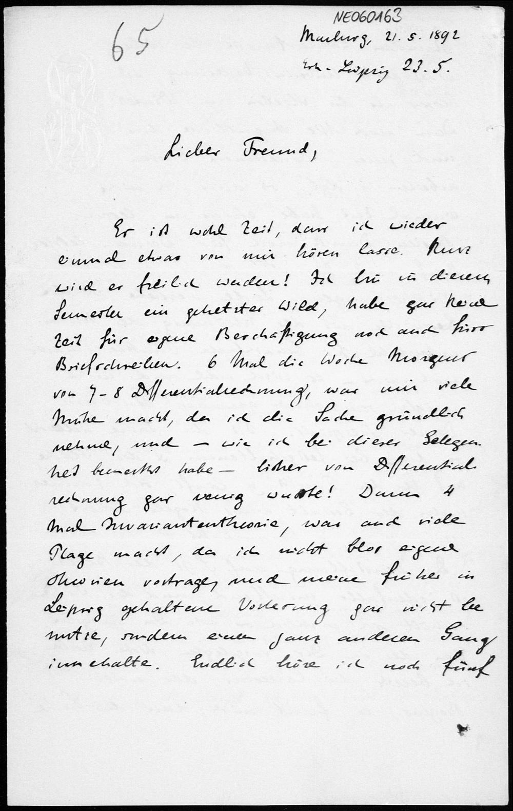 Brief von Eduard Study an Friedrich Engel vom 21.5.1892
