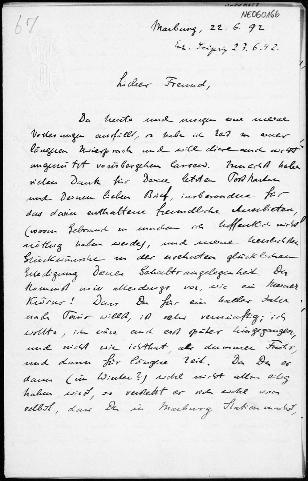 Brief von Eduard Study an Friedrich Engel vom 22.6.1892