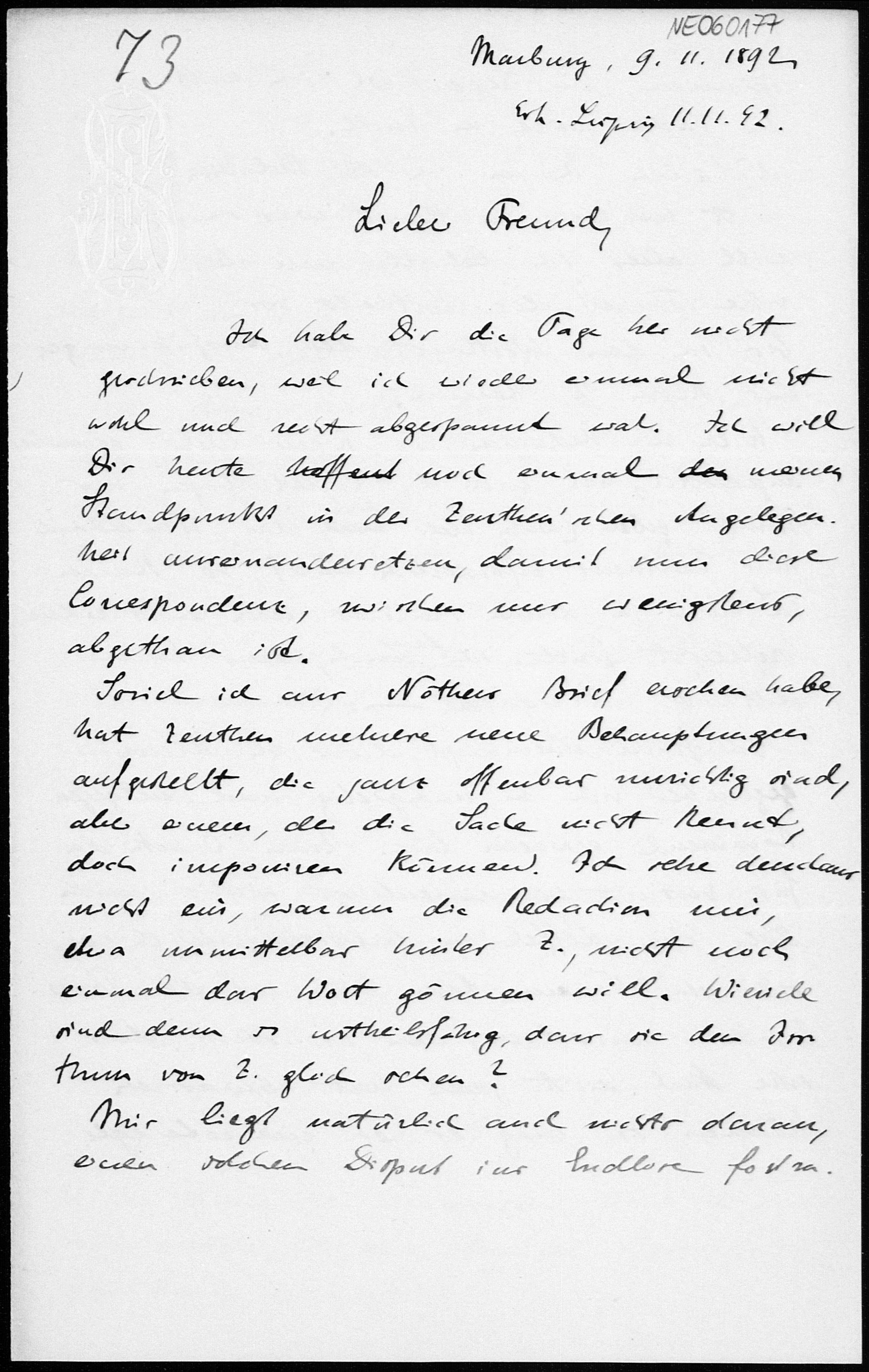 Brief von Eduard Study an Friedrich Engel vom 9.11.1892