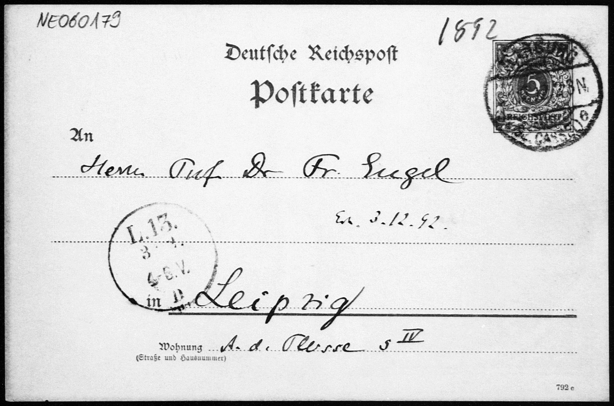 Postkarte von Eduard Study an Friedrich Engel von Ende November/Anfang Dezember 1892