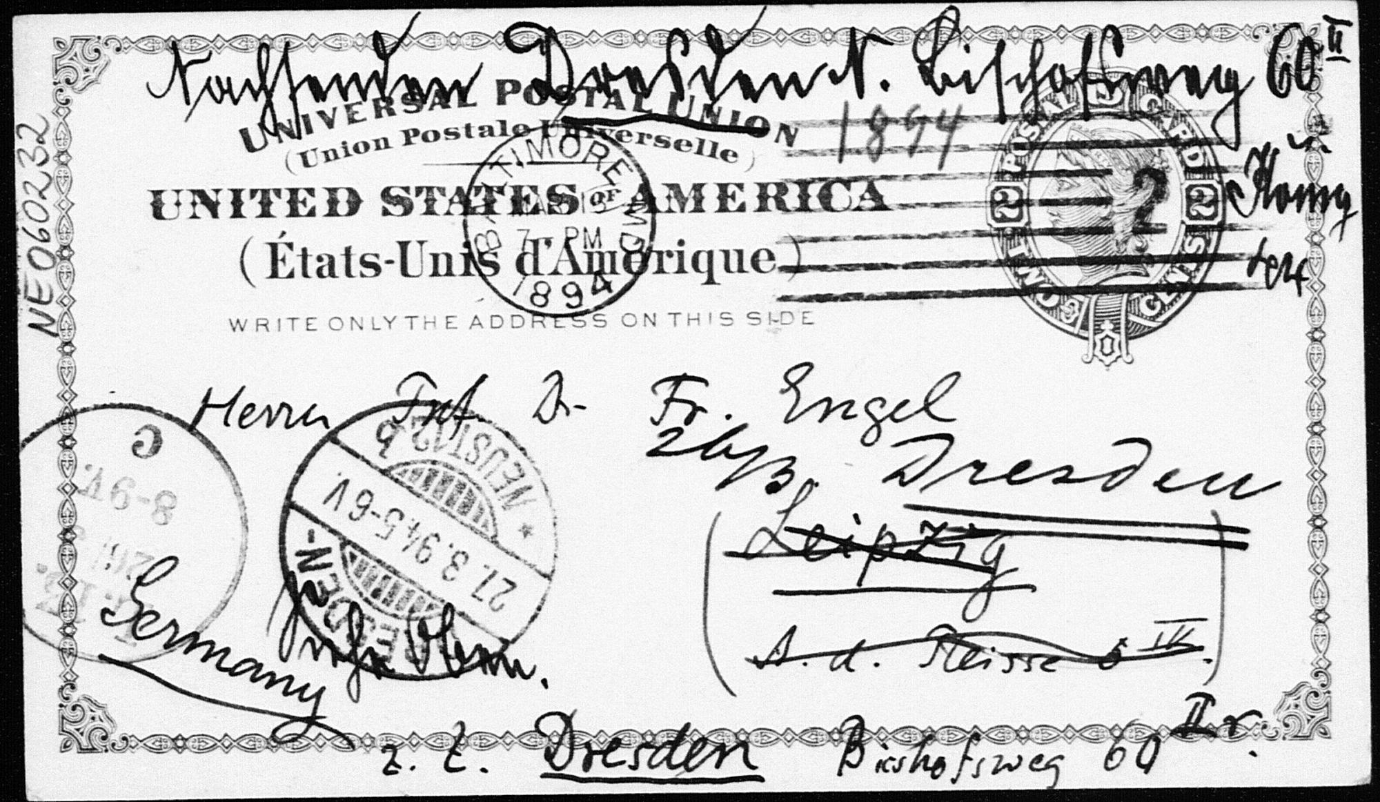 Postkarte von Eduard Study an Friedrich Engel vom 13.3.1894