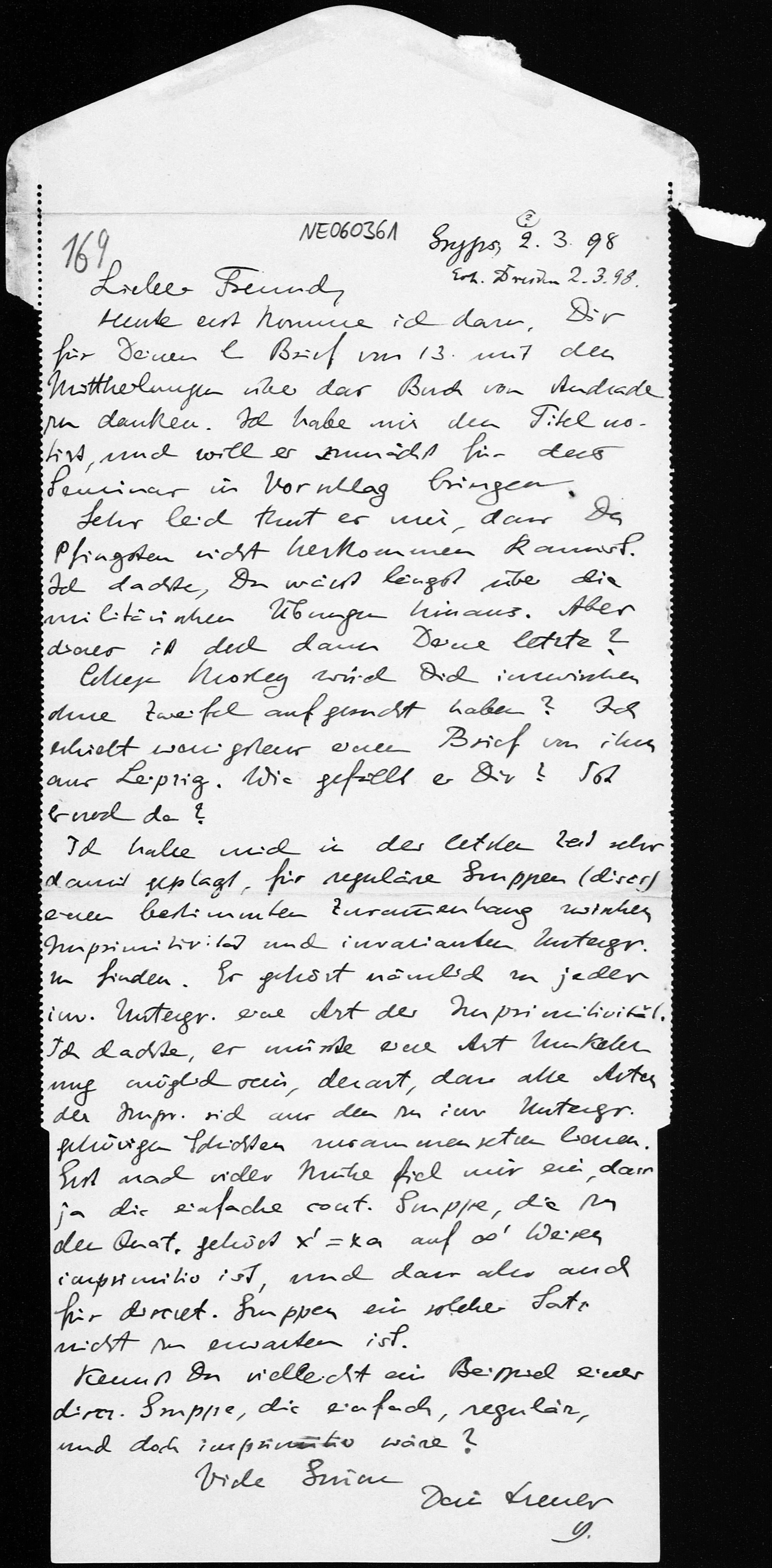 Kartenbrief von Eduard Study an Friedrich Engel vom 1.3.1898