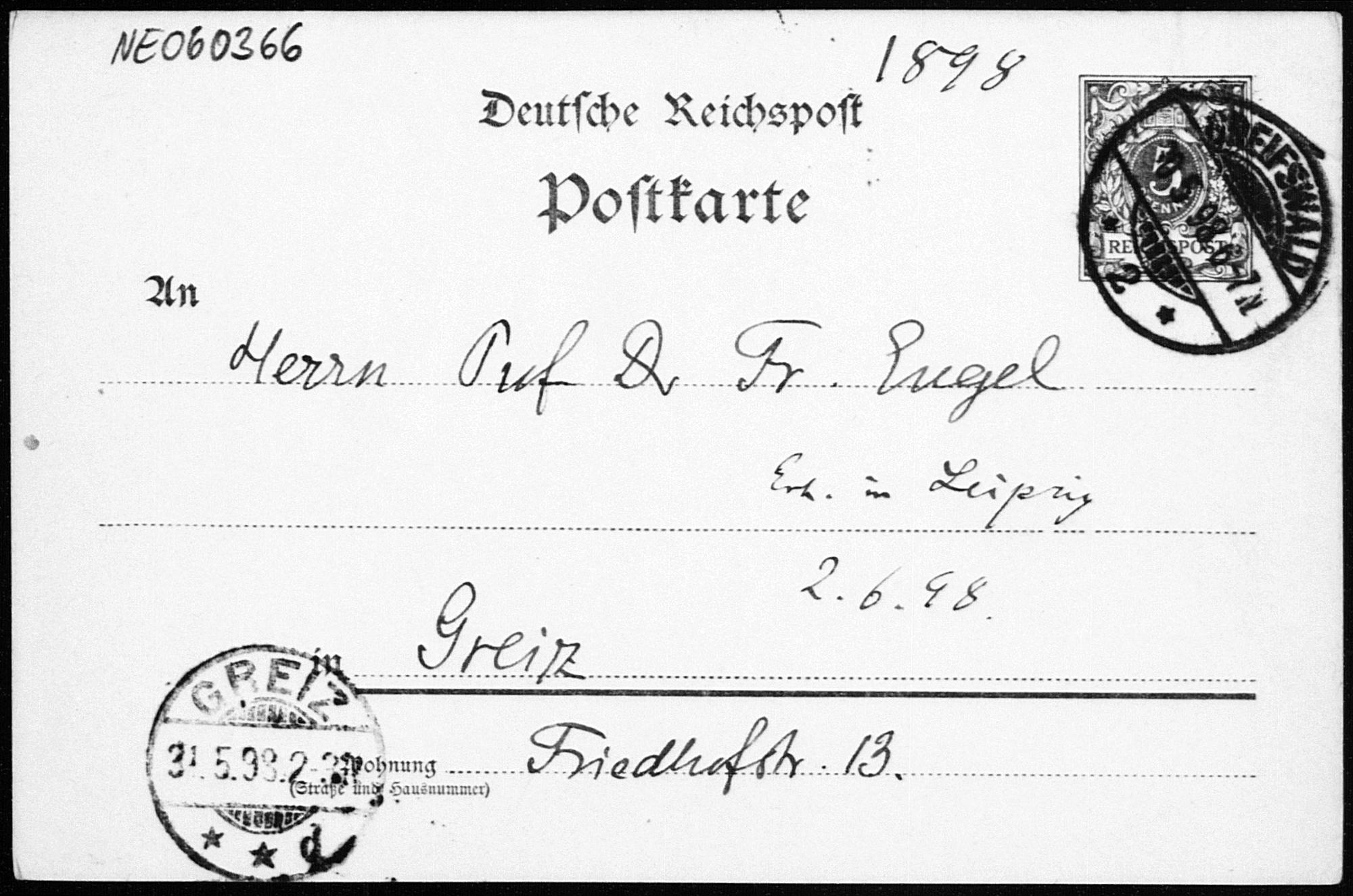 Postkarte von Eduard Study an Friedrich Engel vom 30.5.1898
