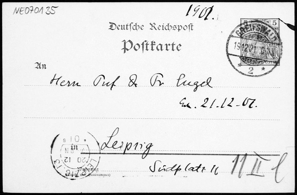 Postkarte von Eduard Study an Friedrich Engel vom 19.12.1901
