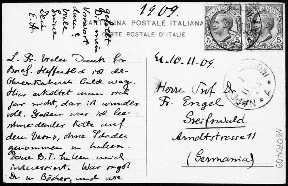 Ansichtskarte von Eduard Study an Friedrich Engel vom 7.11.1909