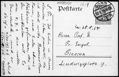 Postkarte von Eduard Study an Friedrich Engel vom 12.8.1914