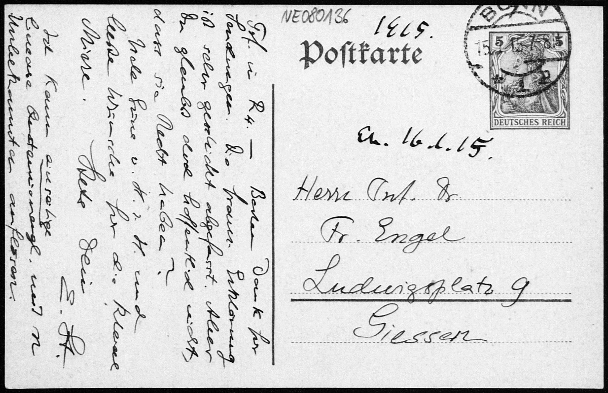Postkarte von Eduard Study an Friedrich Engel vom 15.1.1915