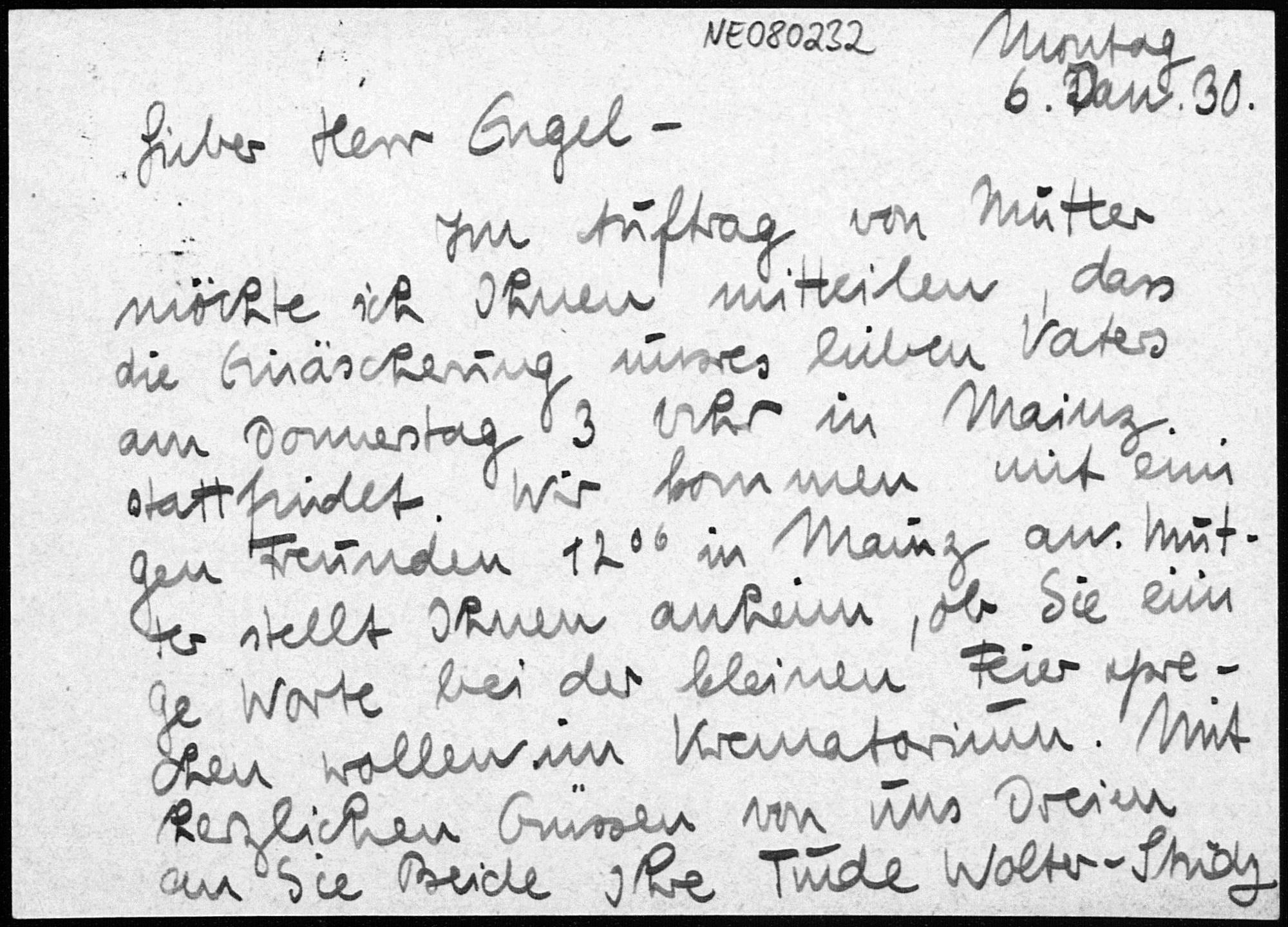 Postkarte von Trude Wolter-Study an Friedrich Engel vom 6.1.1930