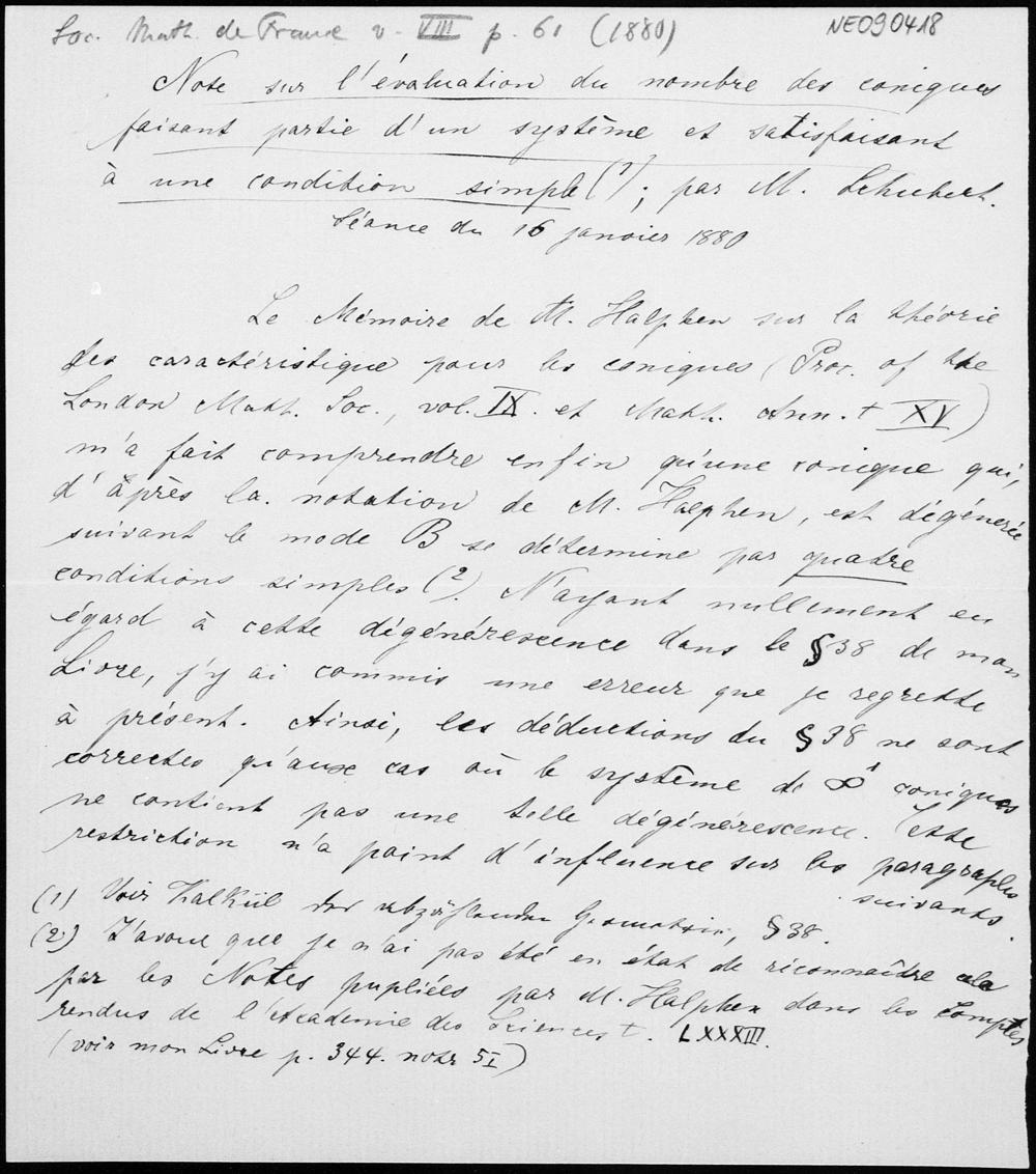 Abschrift des Artikels von Hermann Schubert im Bulletin de la Société de Mathématique de France , Séance du 16.01.1880