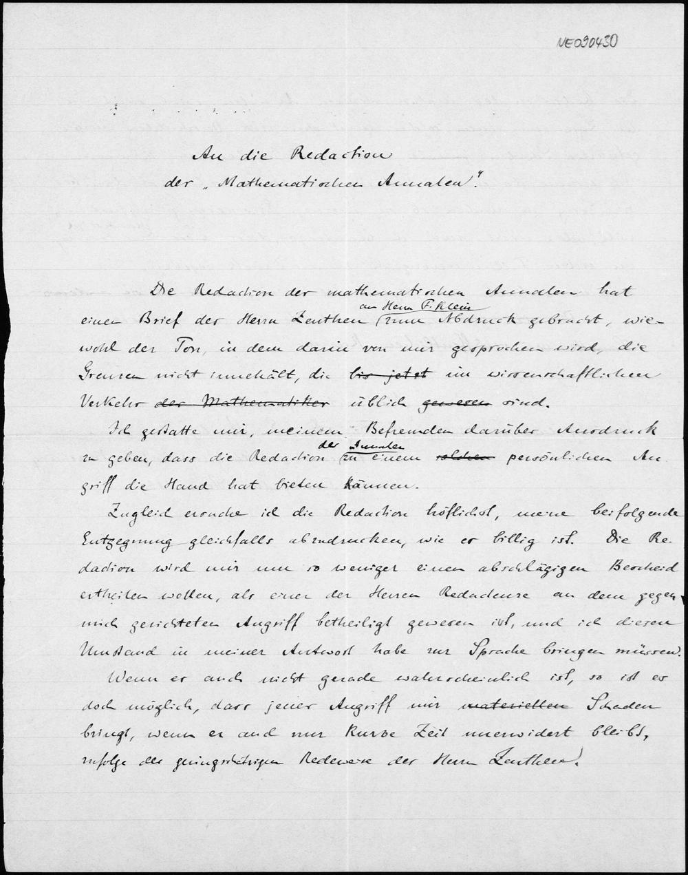 Brief(entwurf?) von Eduard Study an die Redaction der mathematischen Annalen vom 31.12.1890