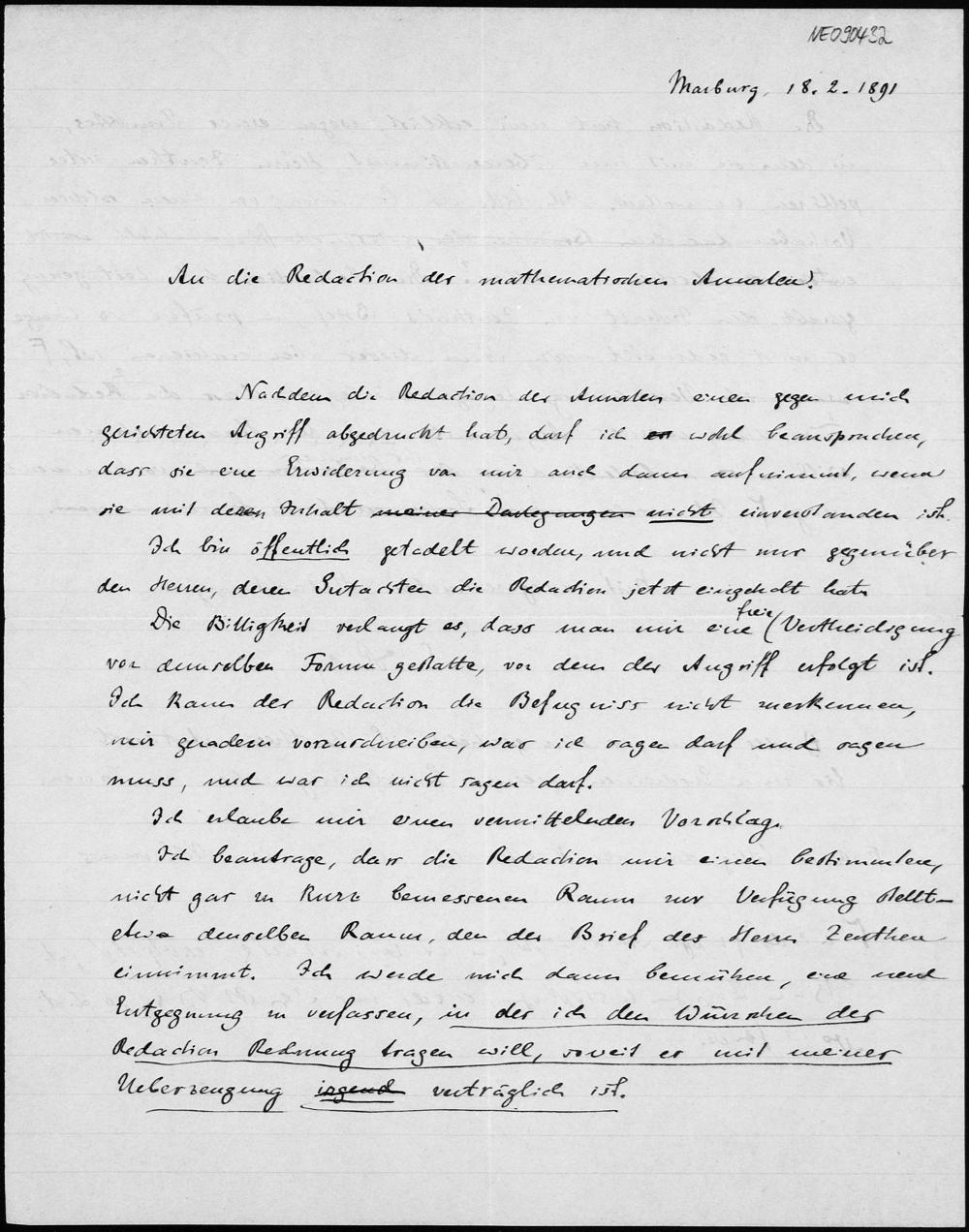 Brief(entwurf?) von Eduard Study an die Redaction der mathematischen Annalen vom 18.2.1891
