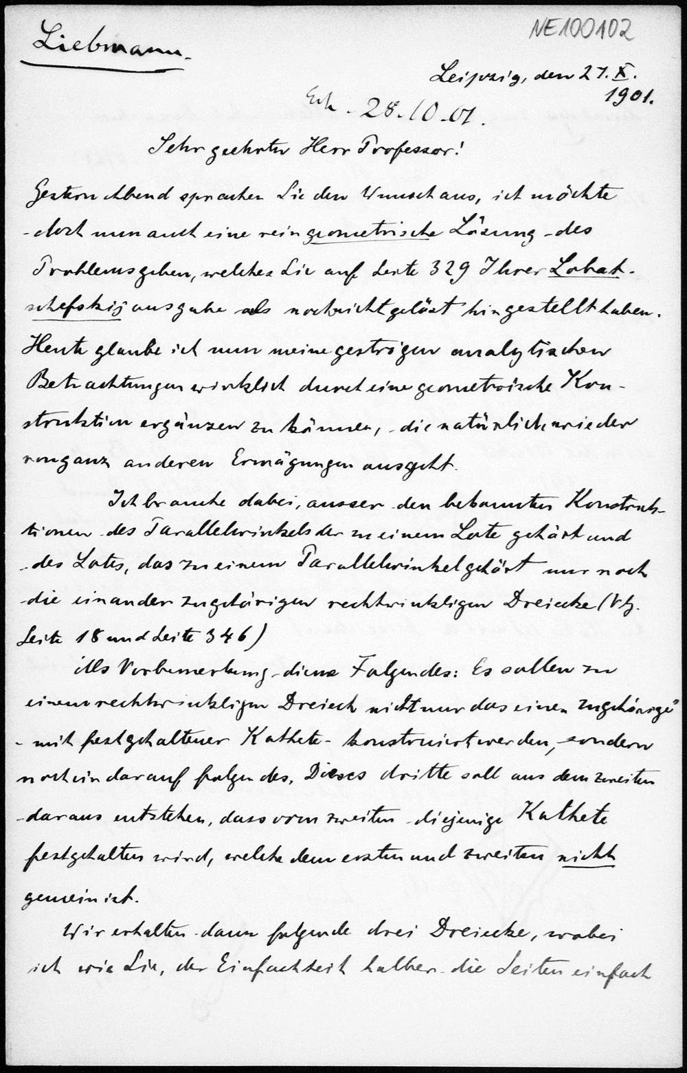 Brief von Heinrich Liebmann an Friedrich Engel vom 27.10.1901