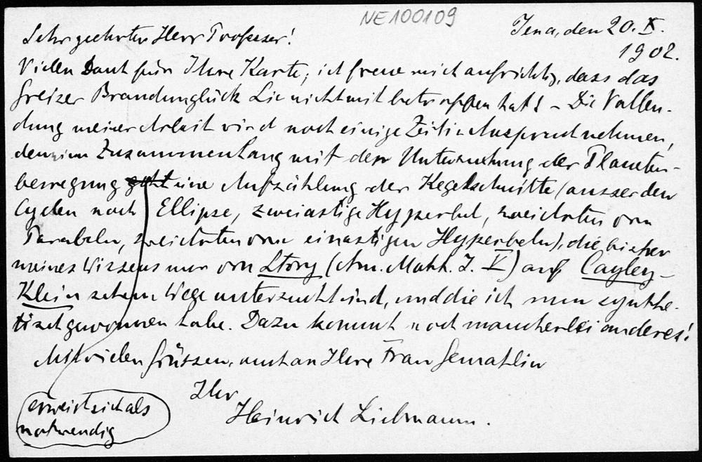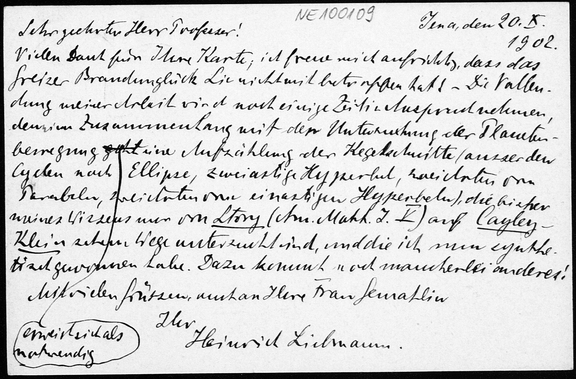 Postkarte von Heinrich Liebmann an Friedrich Engel vom 20.10.1902