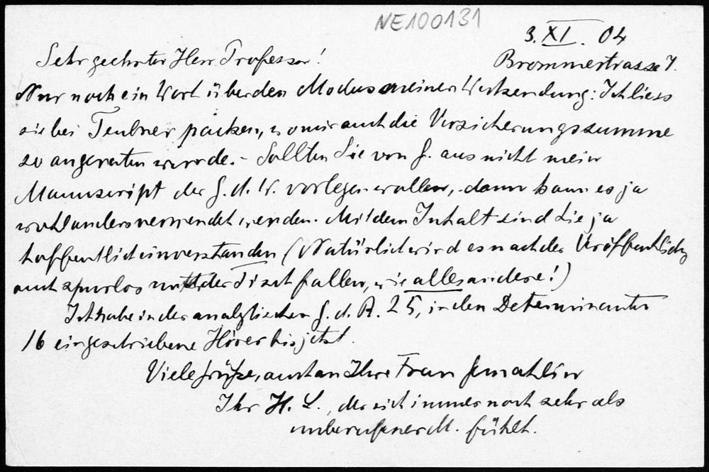 Postkarte von Heinrich Liebmann an Friedrich Engel vom 3.11.1904