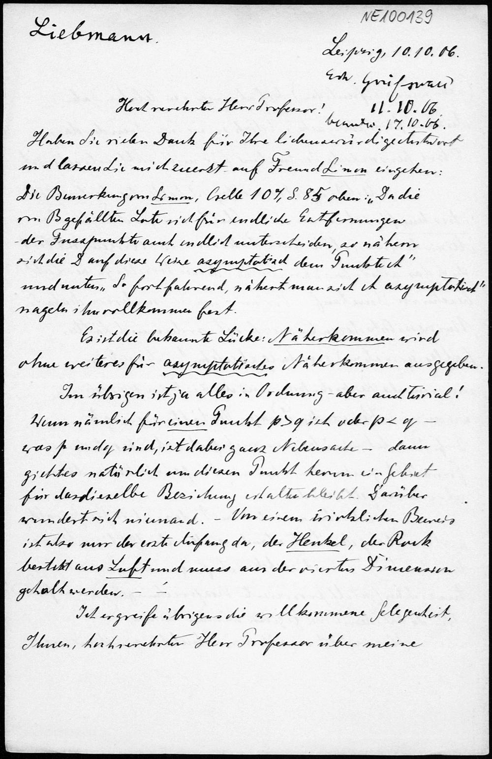 Brief von Heinrich Liebmann an Friedrich Engel vom 10.10.1906