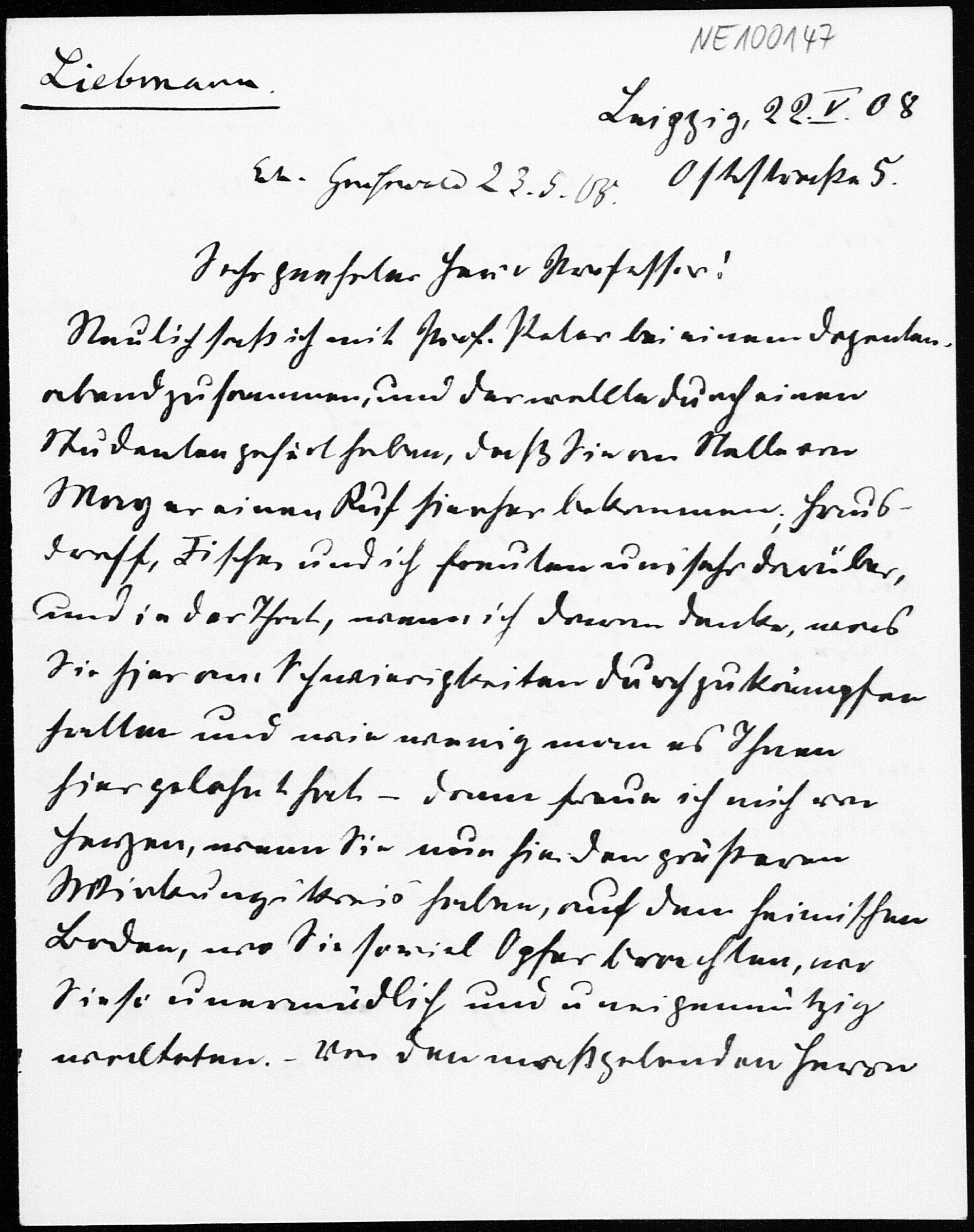 Brief von Heinrich Liebmann an Friedrich Engel vom 22.5.1908