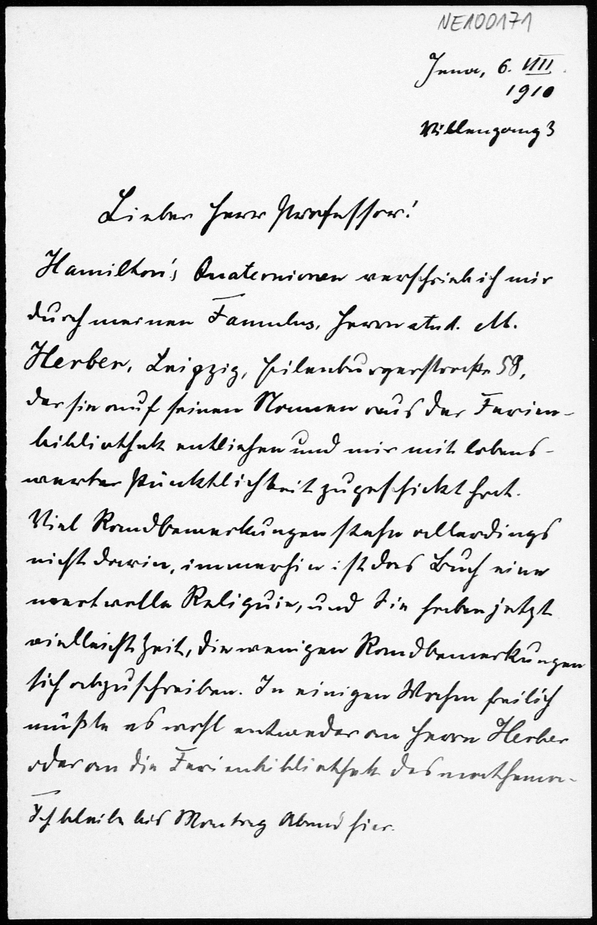 Brief von Heinrich Liebmann an Friedrich Engel vom 6.8.1910