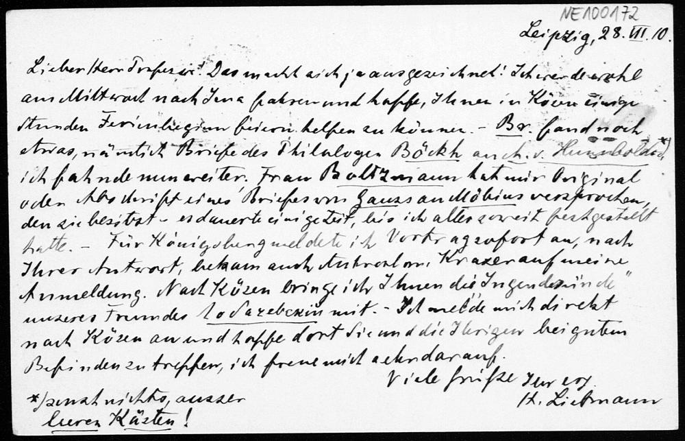 Postkarte von Heinrich Liebmann an Friedrich Engel vom 28.7.1910