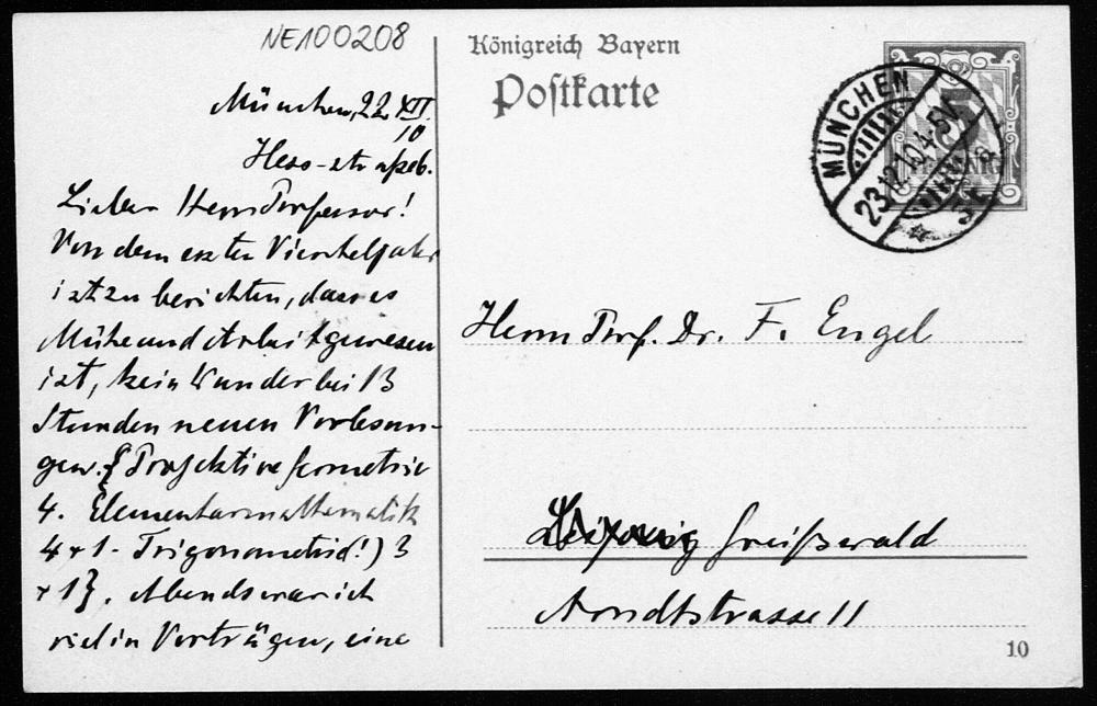 Postkarte von Heinrich Liebmann an Friedrich Engel vom 22.12.1910