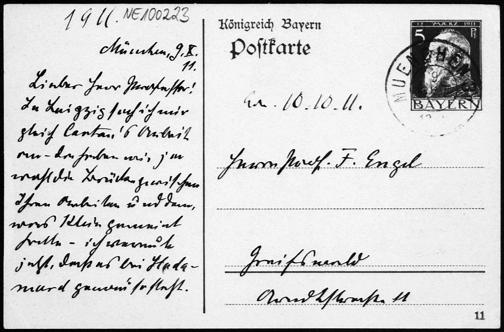 Postkarte von Heinrich Liebmann an Friedrich Engel vom 9.10.1911
