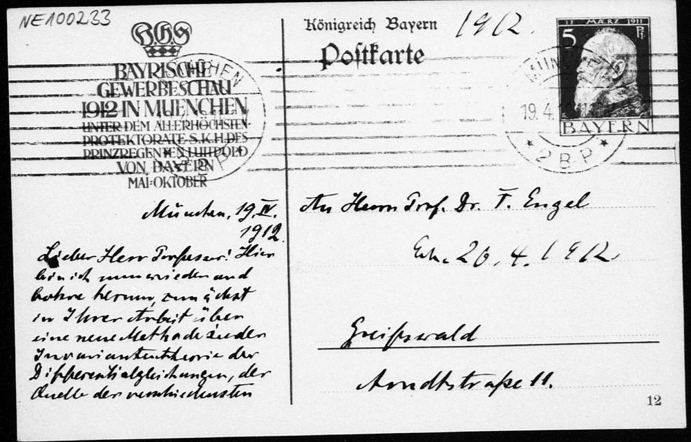 Postkarte von Heinrich Liebmann an Friedrich Engel vom 19.4.1912