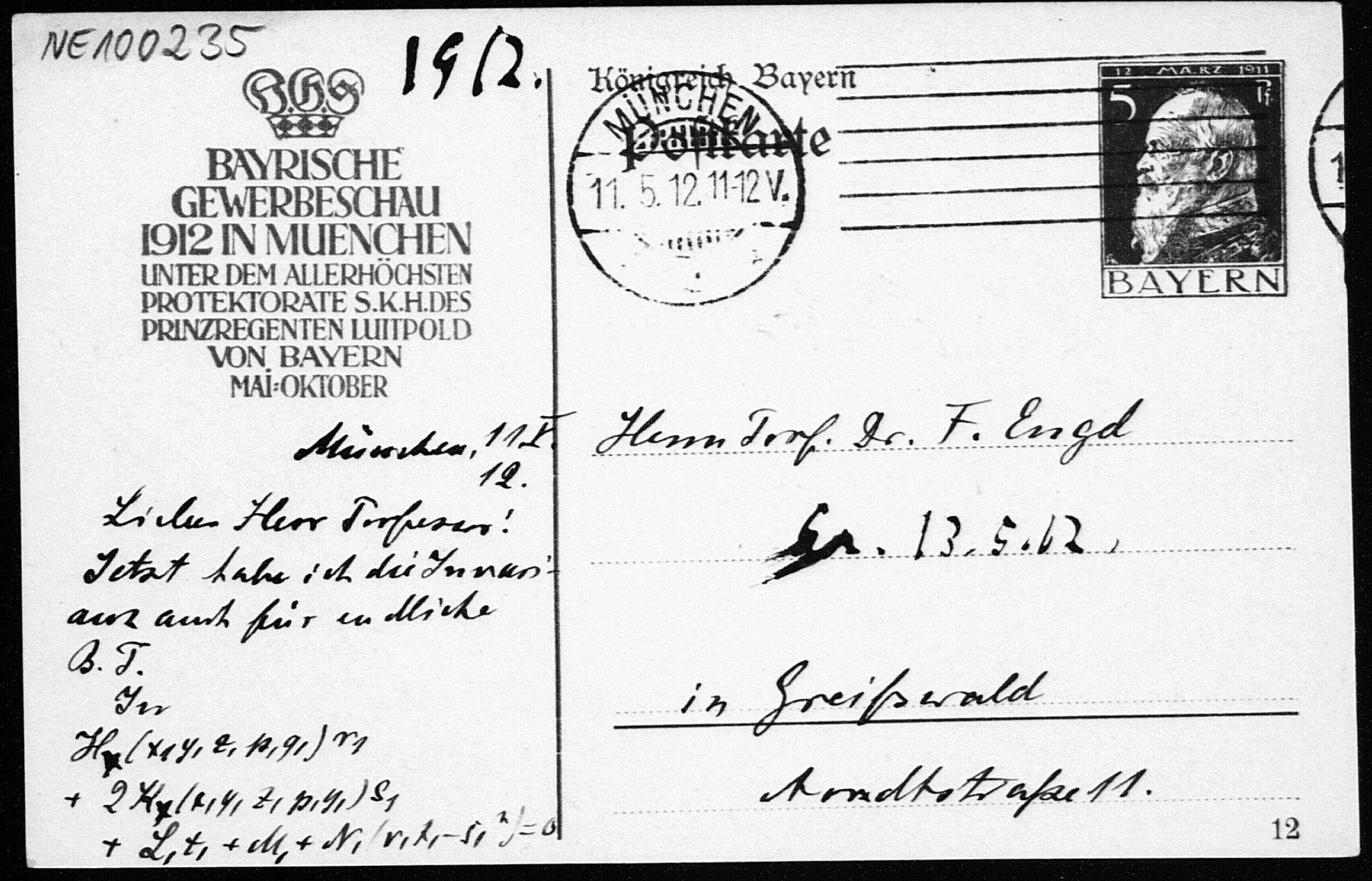 Postkarte von Heinrich Liebmann an Friedrich Engel vom 11.5.1912