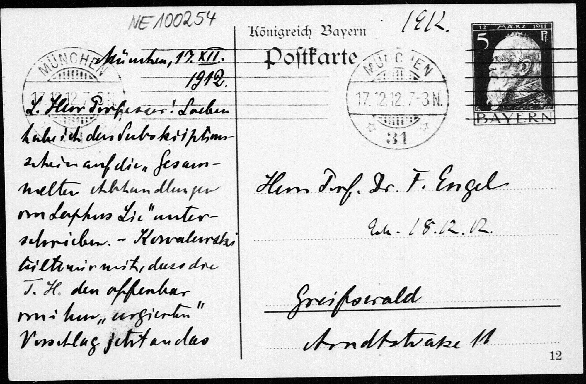 Postkarte von Heinrich Liebmann an Friedrich Engel vom 17.12.1912