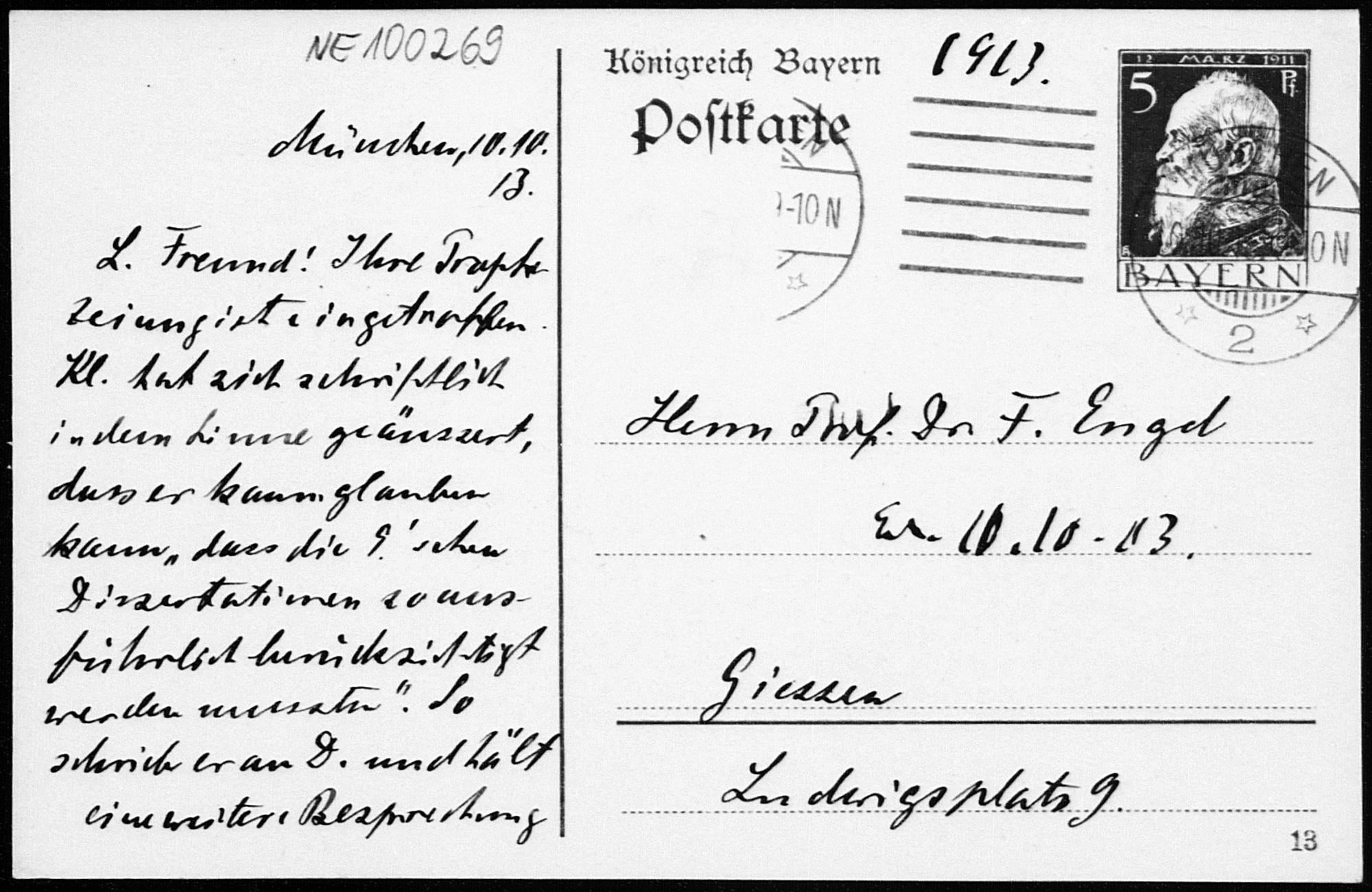 Postkarte von Heinrich Liebmann an Friedrich Engel vom 10.10.1913