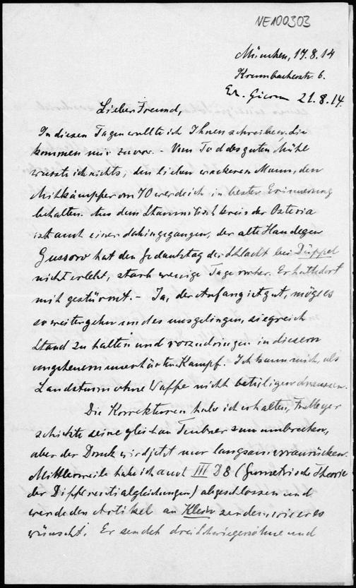 Brief von Heinrich Liebmann an Friedrich Engel vom 17.8.1914