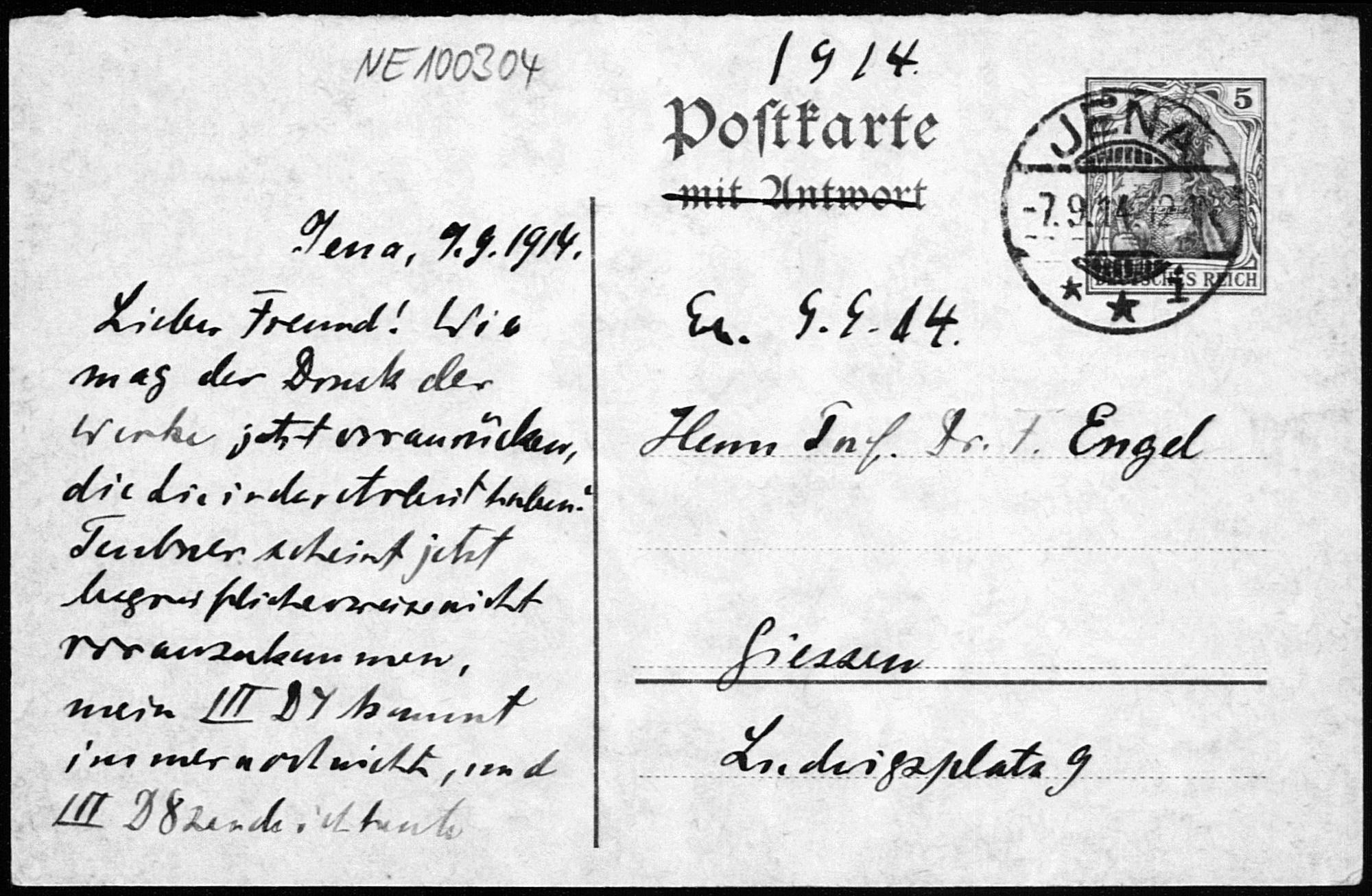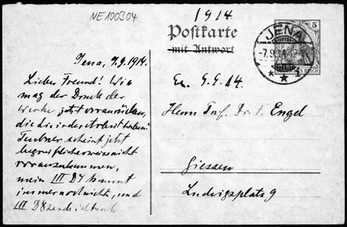 Postkarte von Heinrich Liebmann an Friedrich Engel vom 7.9.1914