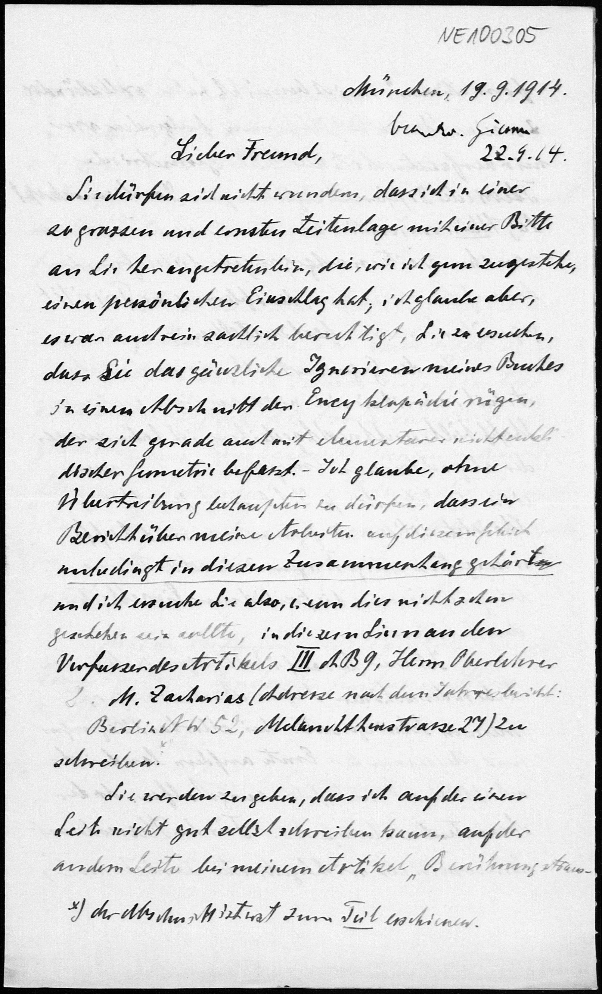 Brief von Heinrich Liebmann an Friedrich Engel vom 19.9.1914