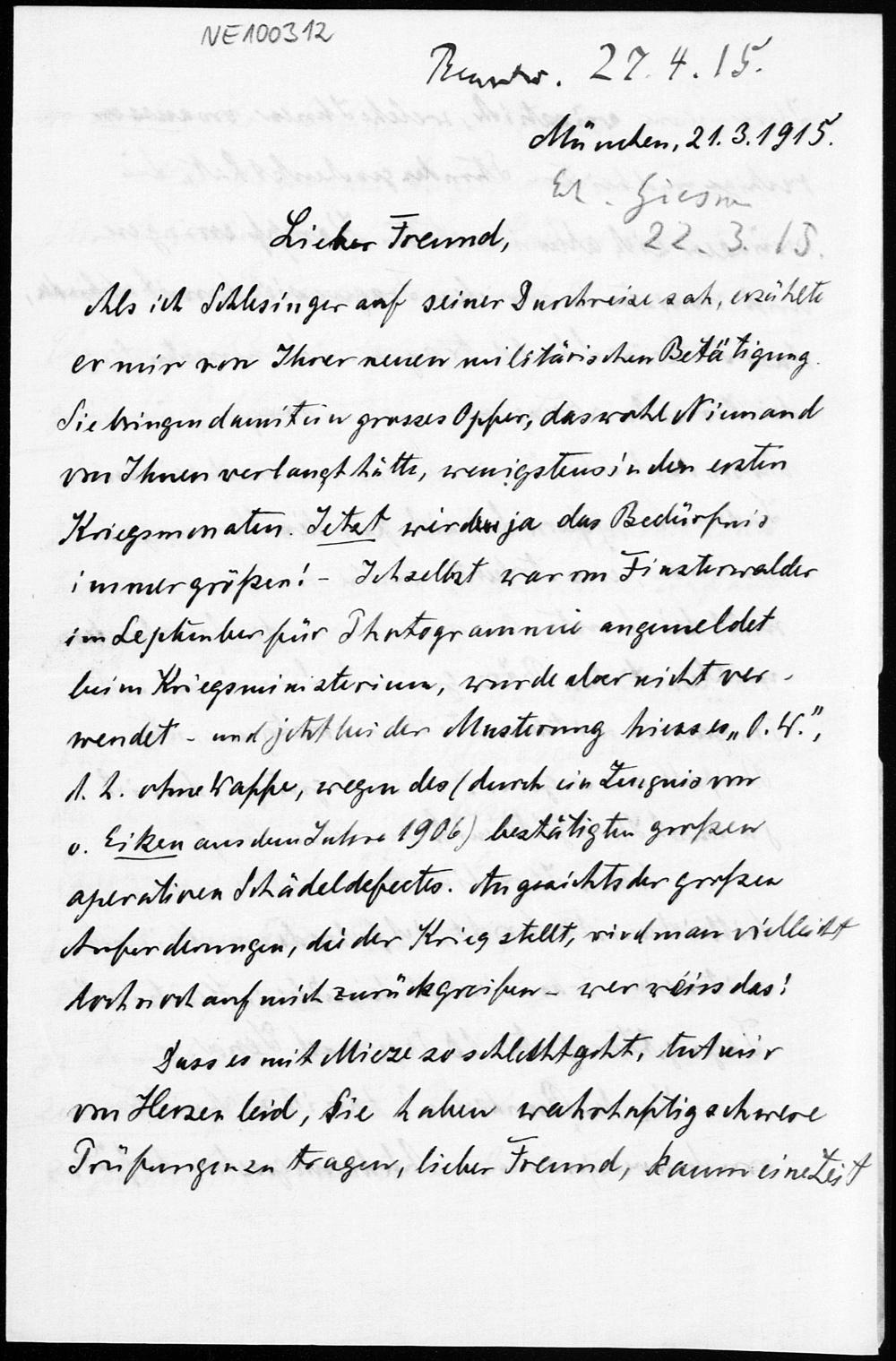 Brief von Heinrich Liebmann an Friedrich Engel vom 21.3.1915