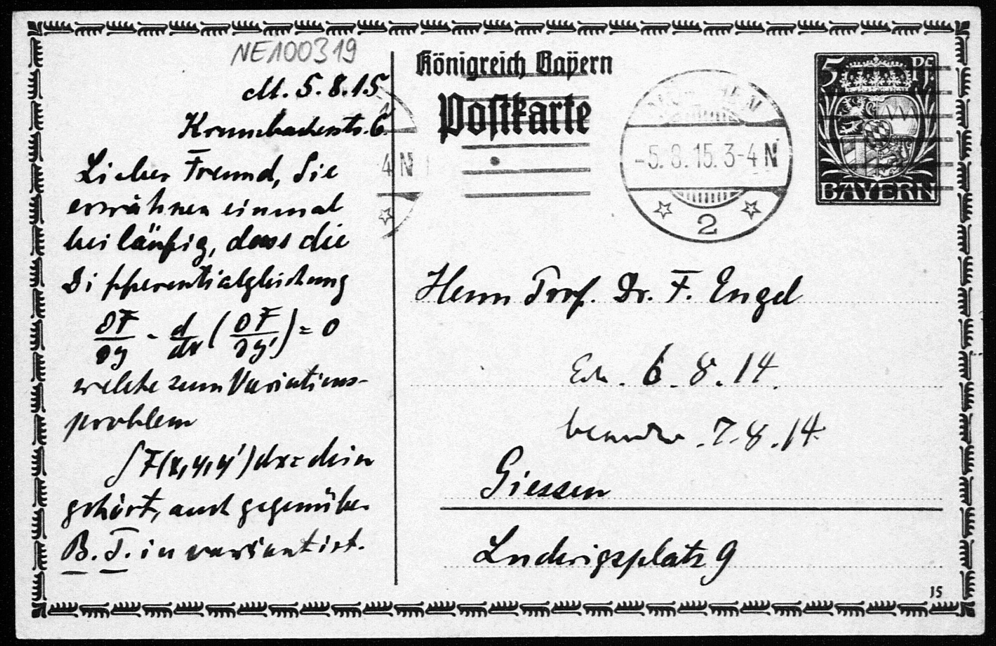 Postkarte von Heinrich Liebmann an Friedrich Engel vom 5.8.1915