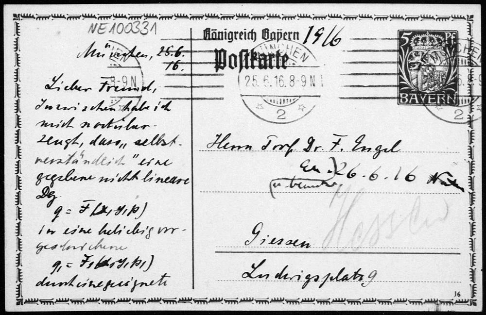Postkarte von Heinrich Liebmann an Friedrich Engel vom 25.6.1916
