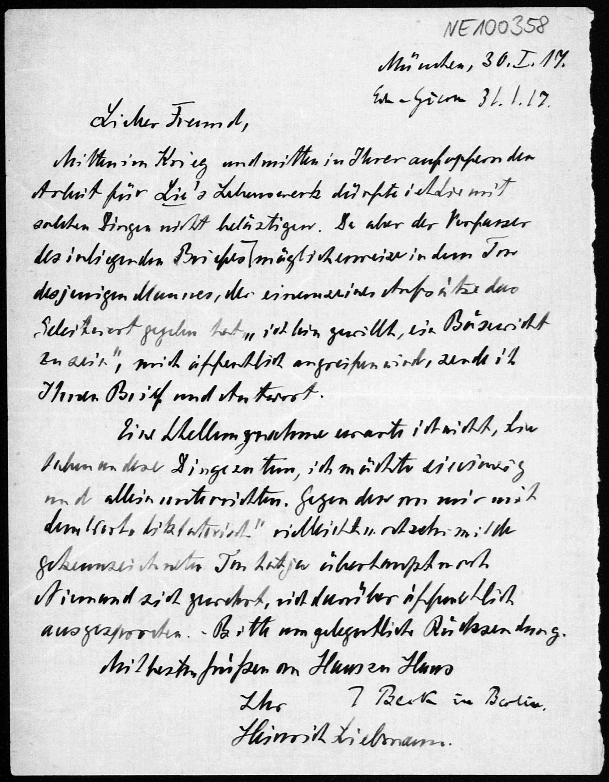 Brief von Heinrich Liebmann an Friedrich Engel vom 30.1.1917