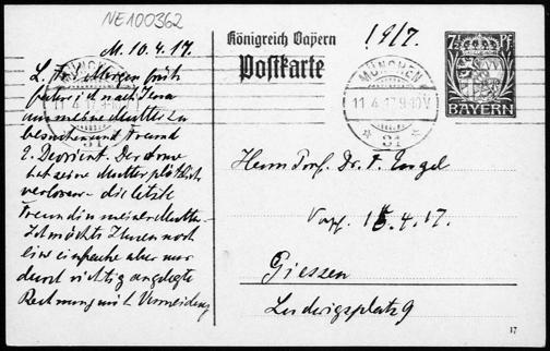 Postkarte von Heinrich Liebmann an Friedrich Engel vom 10.4.1917