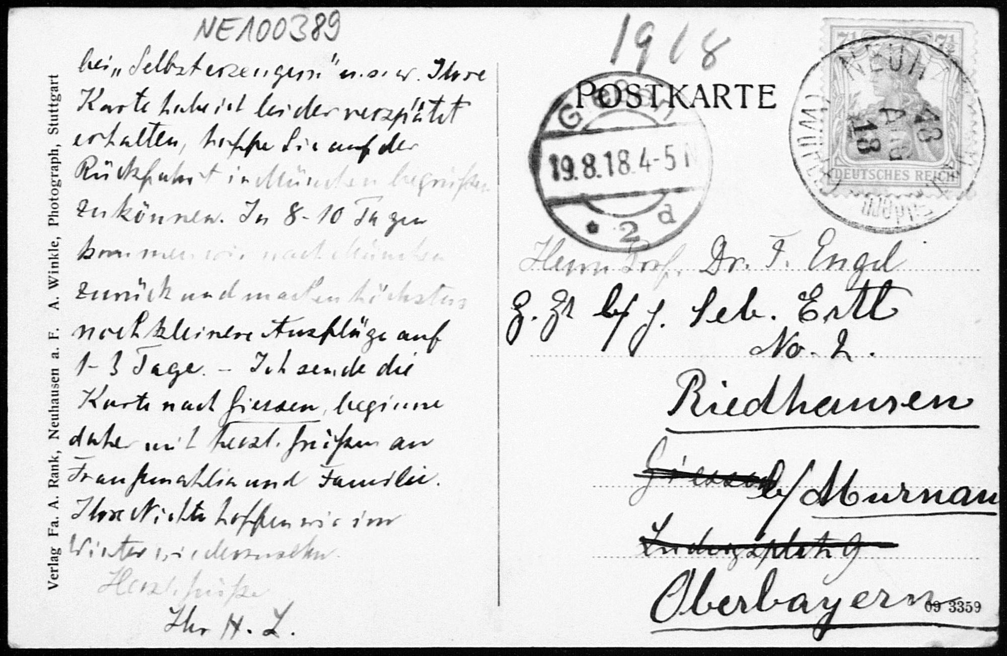 Ansichtskarte von Heinrich Liebmann an Friedrich Engel vom 18.8.1918