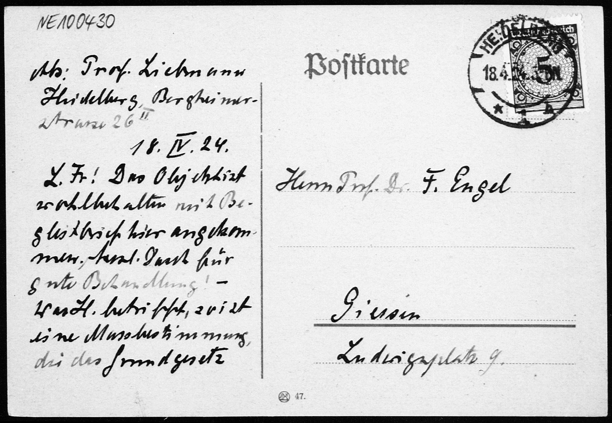 Postkarte von Heinrich Liebmann an Friedrich Engel vom 18.4.1924