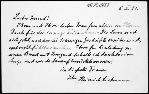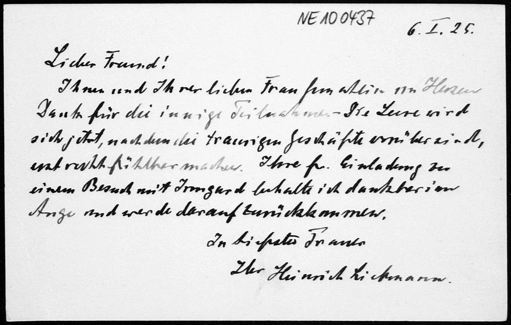 Danksagungskarte von Heinrich Liebmann anläßlich des Todes seiner Frau an Friedrich Engel vom 6.1.1925