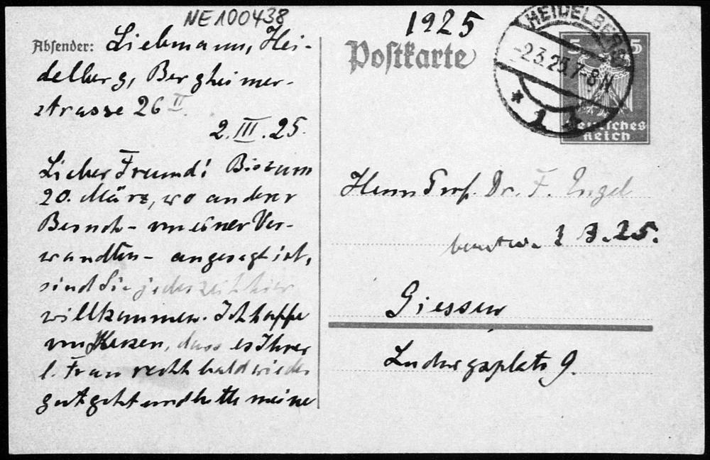 Postkarte von Heinrich Liebmann an Friedrich Engel vom 2.3.1925