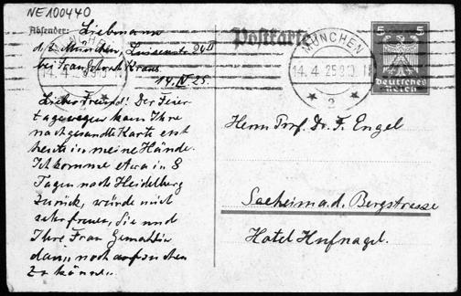 Postkarte von Heinrich Liebmann an Friedrich Engel vom 14.4.1925