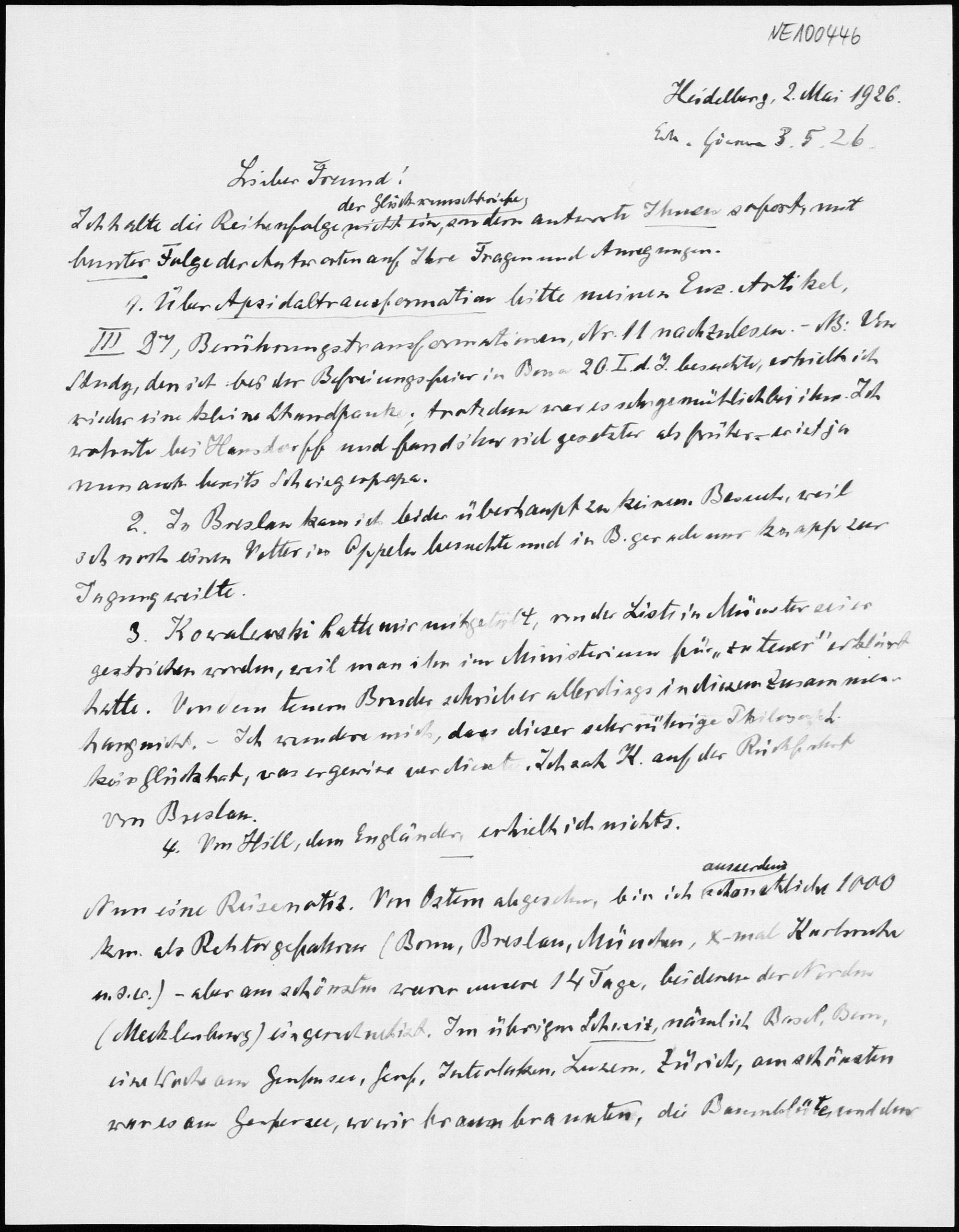 Brief von Heinrich Liebmann an Friedrich Engel vom 2.5.1926
