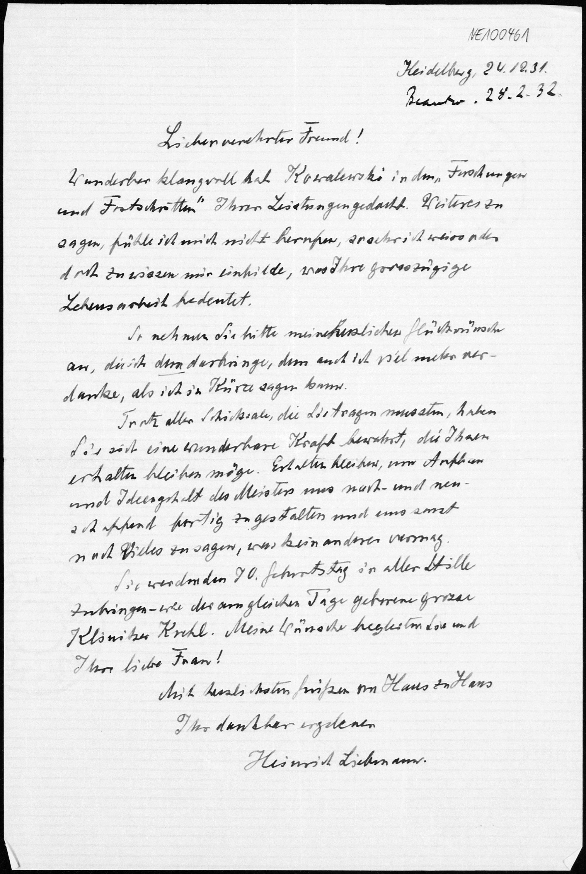 Brief von Heinrich Liebmann an Friedrich Engel vom 24.12.1931