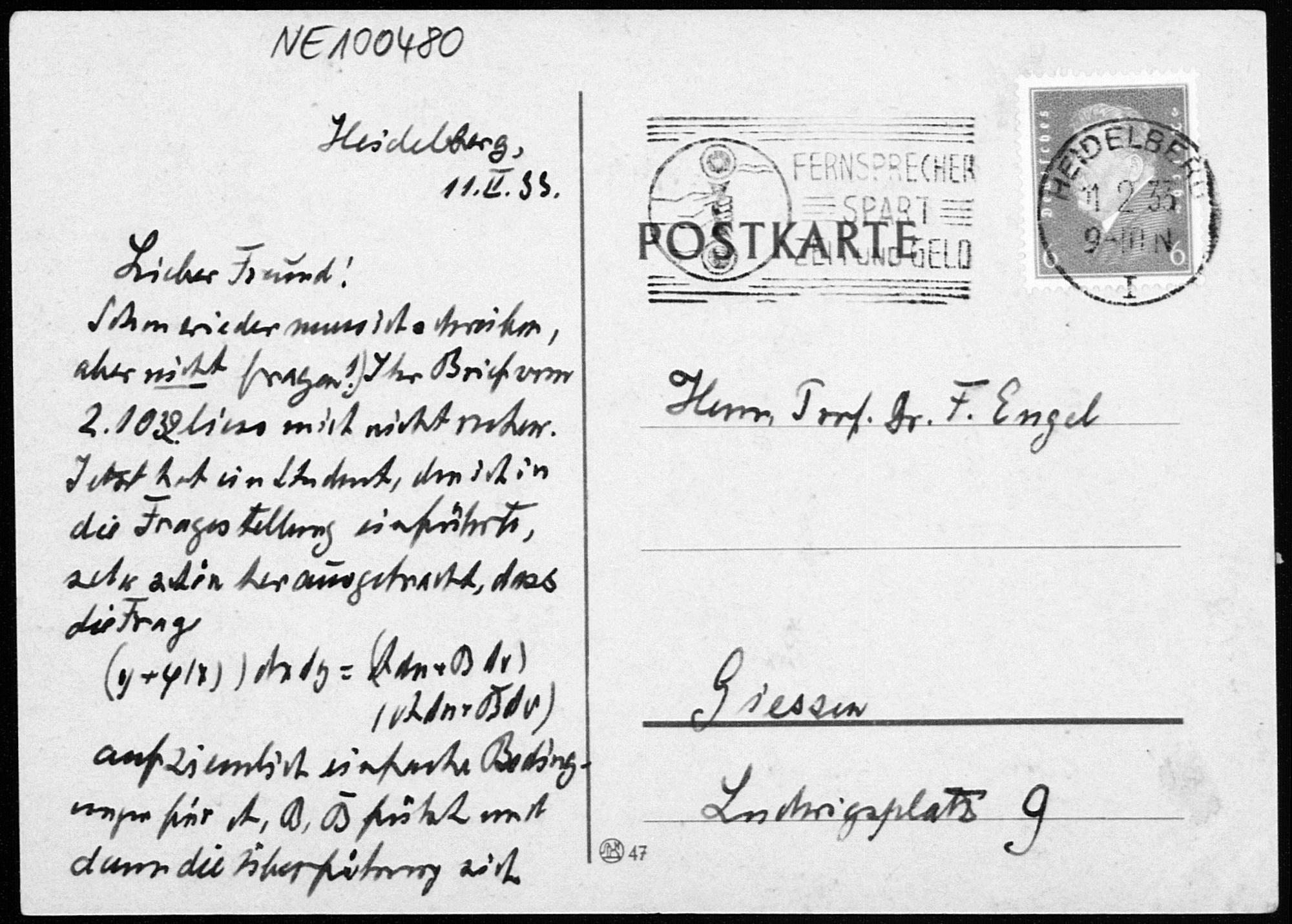 Postkarte von Heinrich Liebmann an Friedrich Engel vom 11.2.1933
