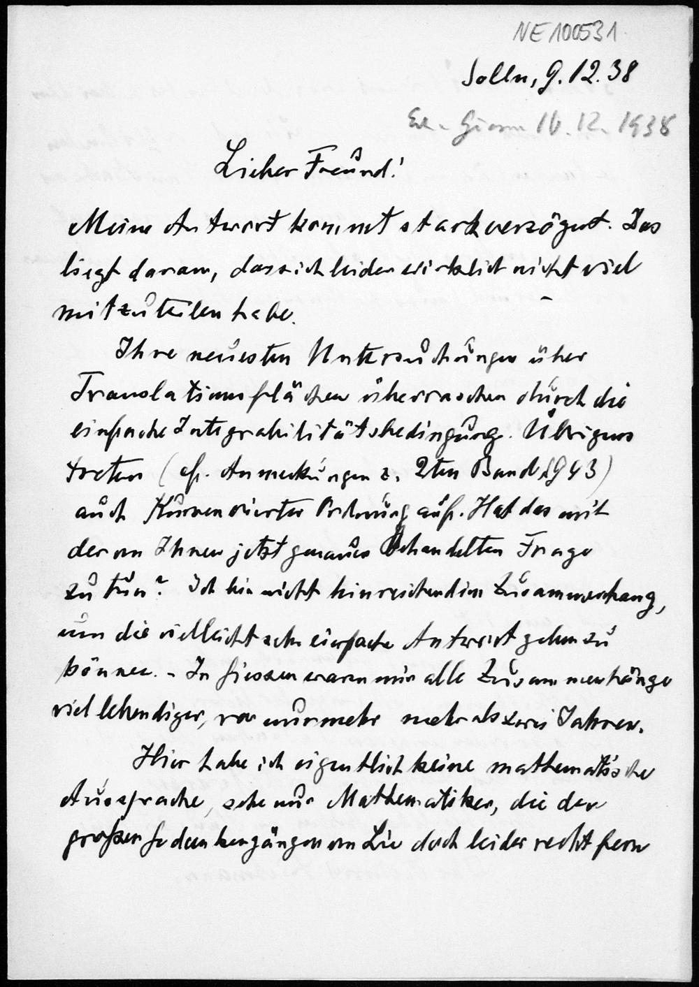 Brief von Heinrich Liebmann an Friedrich Engel vom 9.12.1938
