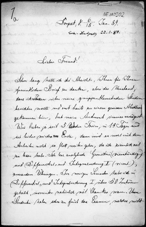 Brief von Friedrich Schur an Friedrich Engel vom 18.1.1889