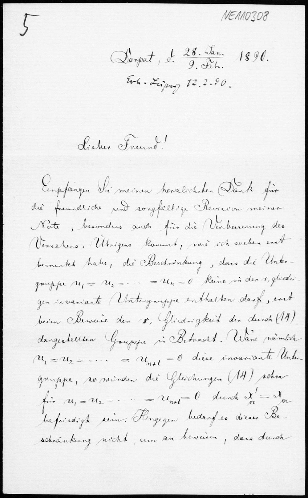 Brief von Friedrich Schur an Friedrich Engel vom 9.2.1890